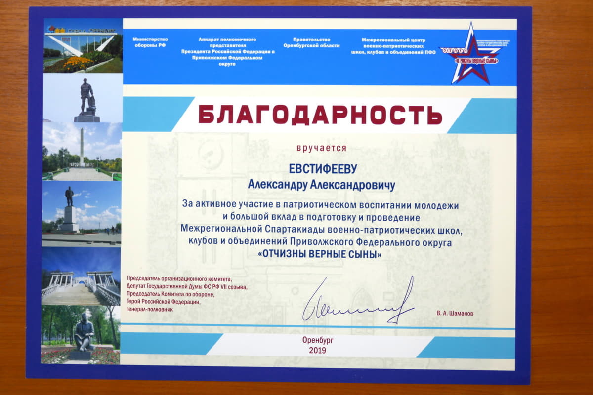 с 1 по 7 июля 2019 года в г. Оренбурге под патронажем Председателя Координационного Совета Межрегионального общественного движения по военно-патриотическому воспитанию генерал-полковника, Героя Российской Федерации Шаманова Владимира Анатольевича проводилась Межрегиональная Спартакиада военно-патриотических школ, клубов и объединений Приволжского Федерального округа по военно-прикладным видам спорта « Отчизны верные сыны».